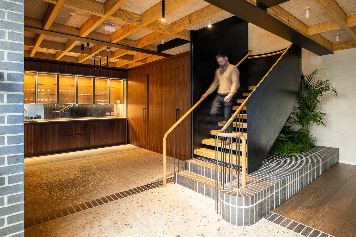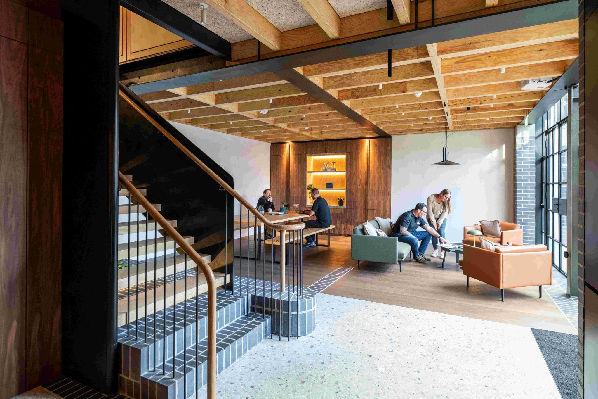 A bespoke winding metal staircase anchors the space, with precision oak joinery and exposed rafters complemented by a vibrant feature garden. Together, these elements set the tone for the building – thoughtful, crafted and timeless.